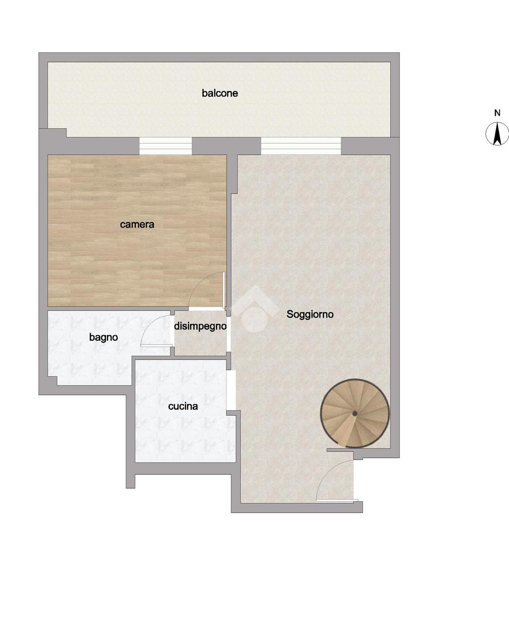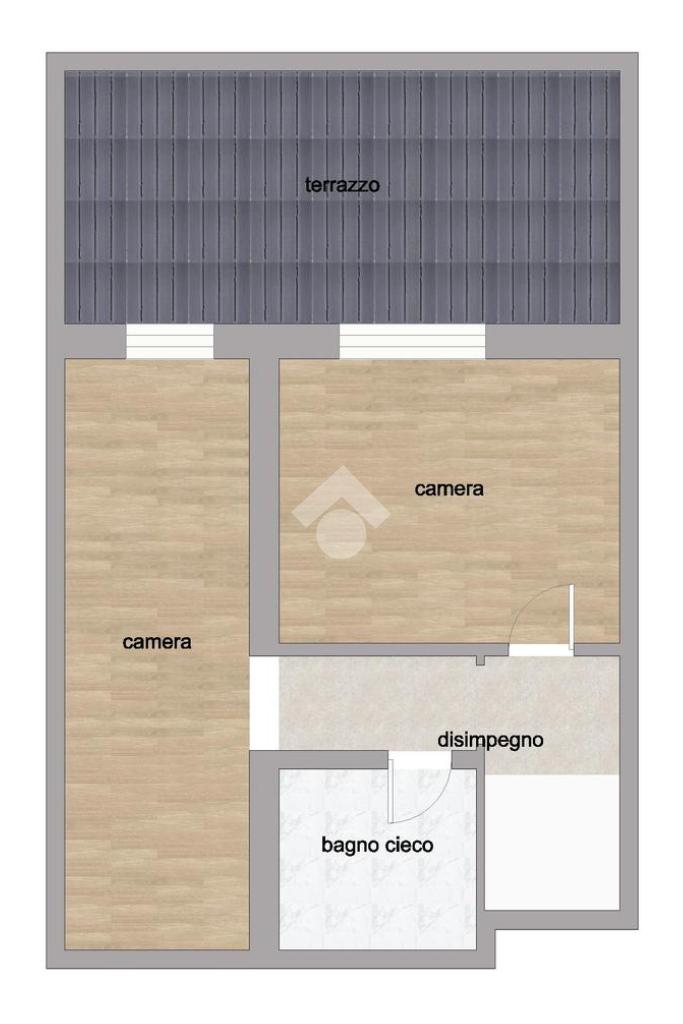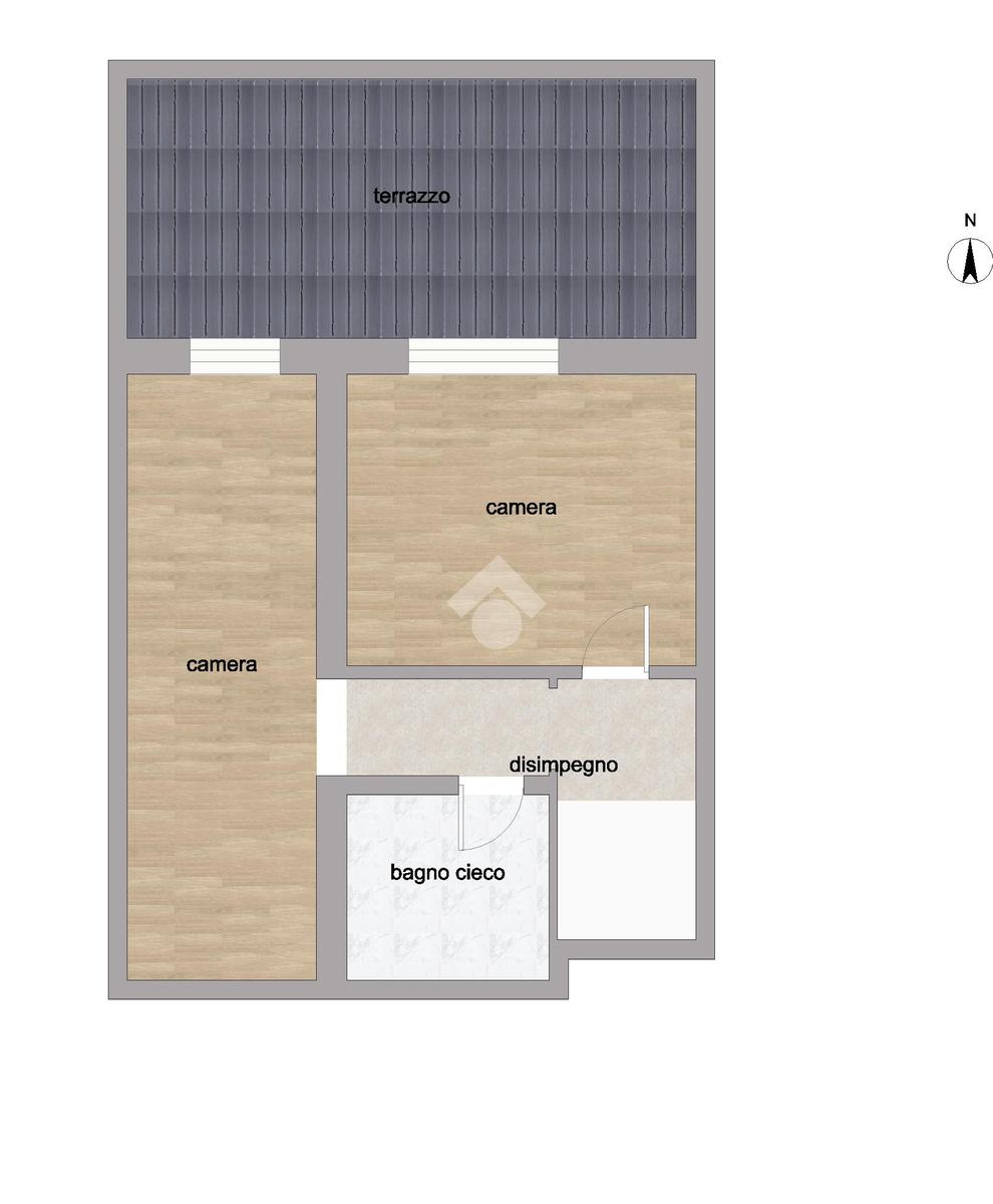 Una scala a chiocciola interna conduce al piano superiore, dove si sviluppa il super attico. Qui troviamo una camera da letto con accesso diretto al terrazzo, un breve corridoio che conduce a un bagno cieco con doccia e una seconda camera, attualmente adibita a ripostiglio, anch’essa con uscita sul terrazzo. Anche in questo caso, gli spazi esterni risultano ampi, riservati e perfettamente abitabili, ideali per momenti di relax.
